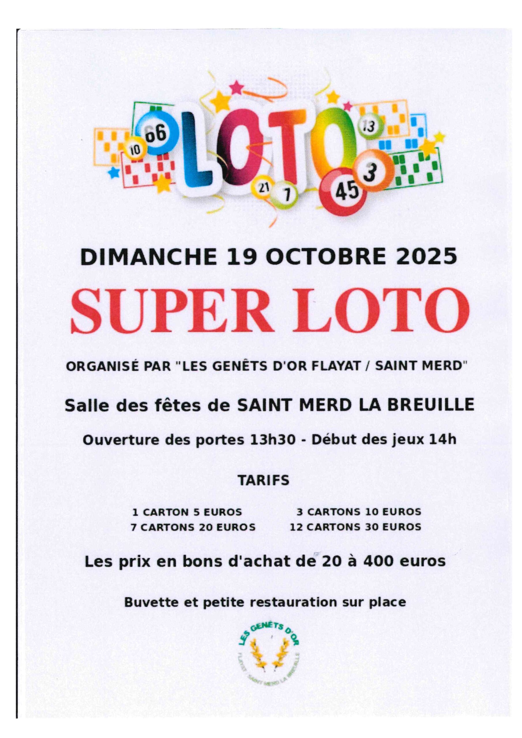 L’association “Les Genêts d’or Flayat/Saint Merd” vous propose un super loto le 19 octobre prochain à Saint-Merd La Breuille. Venez nombreux!