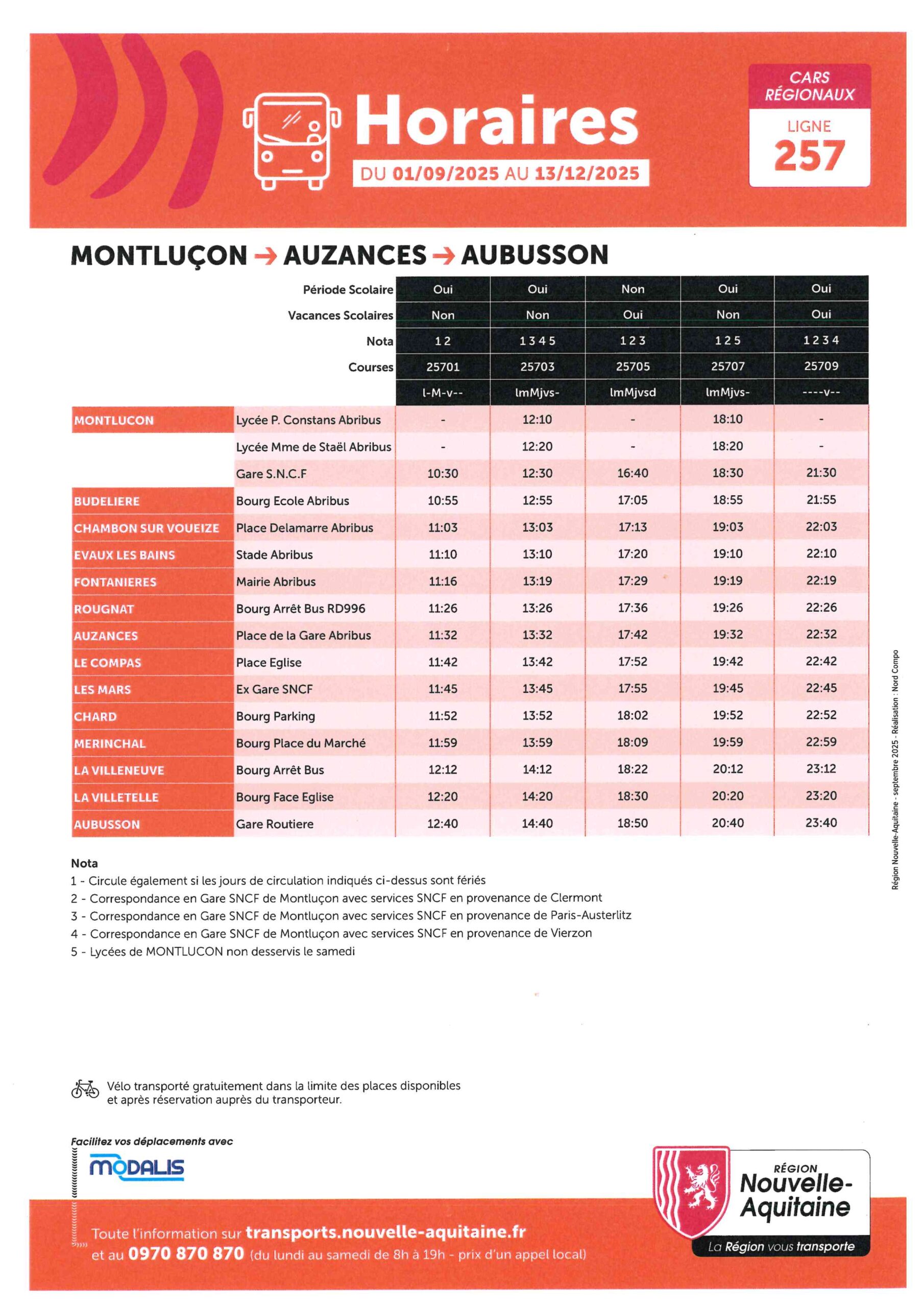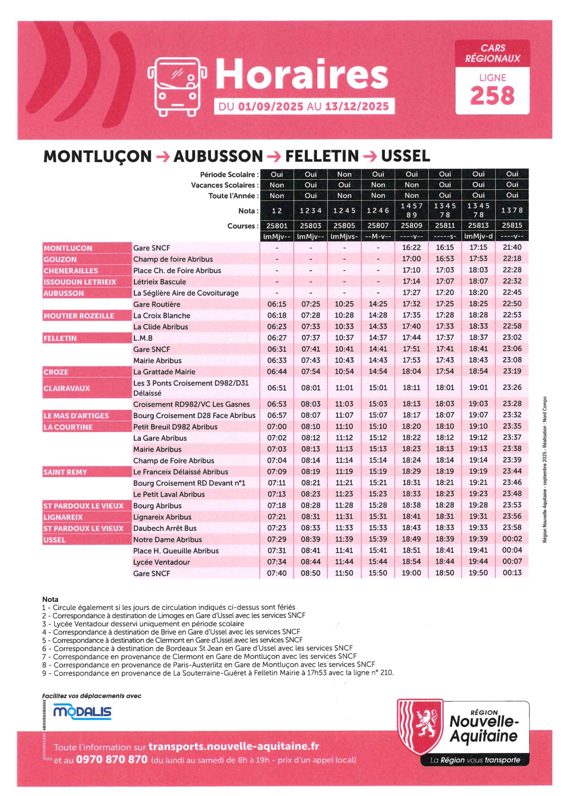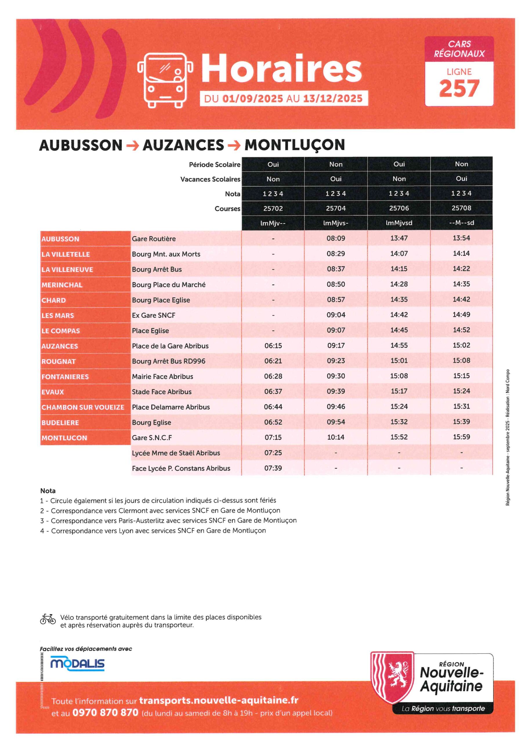 La ligne Ussel – Montlucon a été remplacé par le ligne 257 Aubusson -Montlucon . Le tronçon Ussel- Crocq n’existe plus depuis le 1er septembre 2025. Cependant sur cette ligne 257 il a été maintenu des arrêt à La Villetelle, La Villeneuve et à Mérinchal via Montlucon pour répondre aux demandes des habitants de notre territoire.